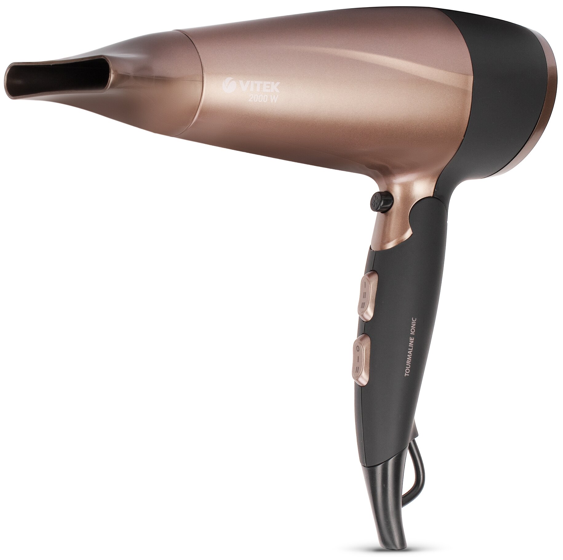 Фен Vitek VT-2238 BN в корпусе черно-коричневых цветов отличается компактным размером для перевозки.
