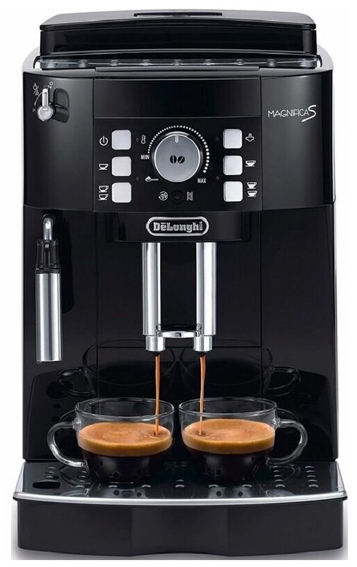 Кофемашина Delonghi выполнена в черном цвете. Оборудована встроенной кофемолкой, жернова которой сделаны из стали, что гарантирует прочность и надежность. Желаемую степень помола можно выбрать из 13 уровней, чтобы найти свой идеальный вкус. Кофемашина имеет традиционный ручной капучинатор. С его помощью вы с легкостью можете приготовить любимый капучино. Для этого необходимо поднести емкость с молоком под капучинатор, и уже через несколько мгновений вы получите взбитую молочную пену. Устройство оборудовано простой и понятной кнопочной панелью управления. Вращением регулятора можно изменить крепость кофе, а нажатие кнопки позволяет выбрать порцию необходимого объема. Также можно запрограммировать нужную температуру и жесткость воды.