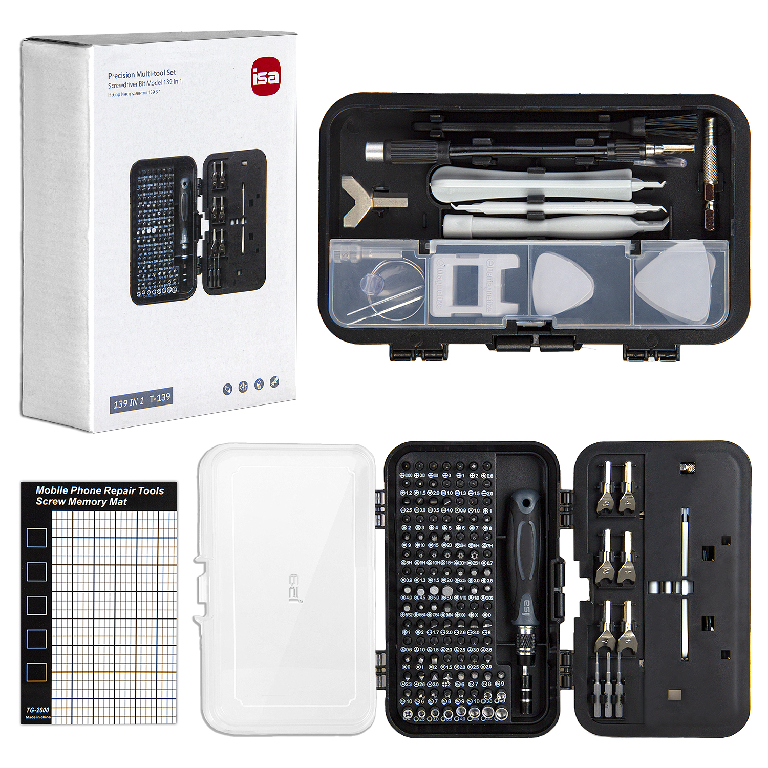 В набор входит 118 высокоточных бит, ручка отвертки - 1 шт. Гибкий удлинительный вал - 1 шт. Удлинитель - 1 шт. Пинцет - 1 шт. Пластиковые инструменты для монтажа - 3 шт. Скрепка для извлечения сим - карты - 2 шт. Намагничиватель/размагничиватель - 1 шт. Присоска - 1 шт. Держатель для бит - 1 шт. Отмычка - 6 шт. Крюковой привод - 1 шт. Винтовой коврик с памятью - 1 шт. Щетка - 1 шт.