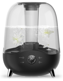 Если вы любите все необычное, этот увлажнитель создан для вас. Резервуар для воды выполнен из прозрачного стекла с легким сероватым затемнением, которое интересно гармонирует с основным цветом корпуса. Это дает простор для фантазии и экспериментов: в резервуар можно добавлять различные декоративные предметы и менять их по настроению, каждый раз создавая новое настроение. Изящные маленькие ножки смотрятся очень мило и трогательно. Они выполнены в серебристом оттенке и хорошо гармонируют с приборной панелью увлажнителя.